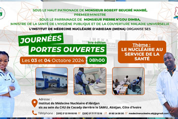 L’introduction de la Médecine Nucléaire en Côte d’Ivoire (CI) s’inscrit dans le cadre de la coopération avec les Nations Unies en matière de développement durable. Les échanges avec l’AIEA et l’Etat de CI démarrent par le premier Programme de Coopération Technique sur la création du service de référence de MN nommé IVC/6/002 en octobre 1992. Cet appui de l’AIEA se concrétise dès 1997 par la formation diplômante des 2 premiers médecins nucléaires, puis par l’équipement dudit service en gamma caméra simple tête, en intrants pour les scintigraphies planaires et en compteur gamma et intrants pour les dosages RIA des hormones et marqueurs tumoraux. Cette coopération avec l’AIEA a abouti à la construction et à l’équipement en 2012 du nouveau centre de Médecine Nucléaire érigé en Institut et fonctionnant depuis 2014. La coopération avec l’AIEA a continué jusqu’à ce jour, permettant d’aboutir en 2012 à des dons d’équipement à l’IMENA, dont la construction a été entièrement financée par l’Etat de Côte d’Ivoire à hauteur de 3 milliards de francs CFA.